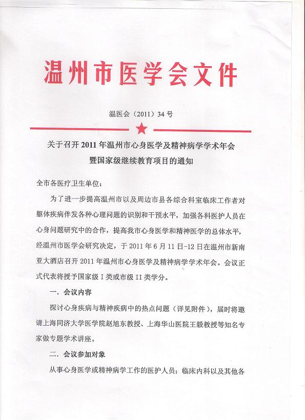 2011年温州市医学会心身医学学会、精神病学学会学术年会暨国家级继续教育项目的通知