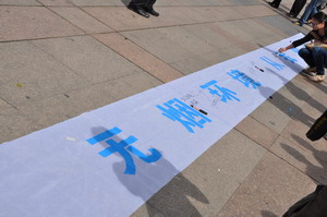 参加启动仪式的代表纷纷上前,在条幅上签上自己的名字,写下一份“无烟环境,从我做起”的承诺。