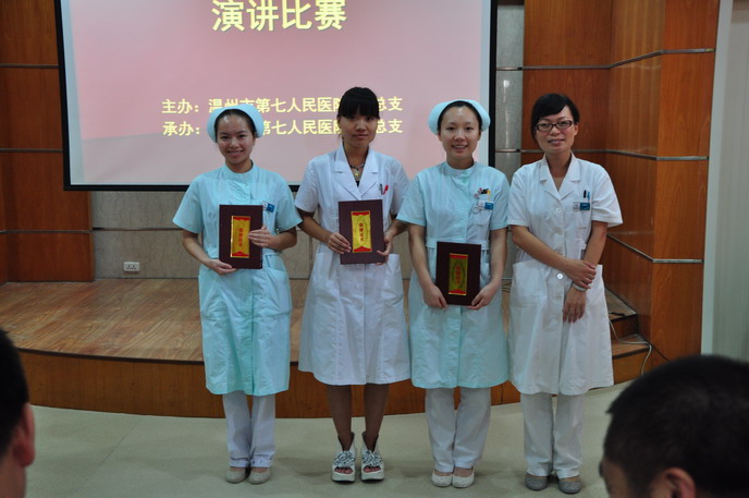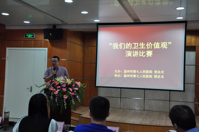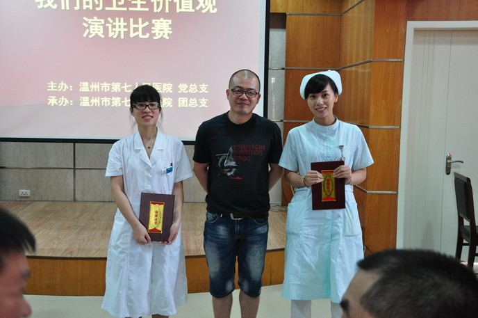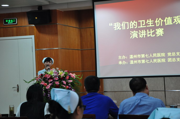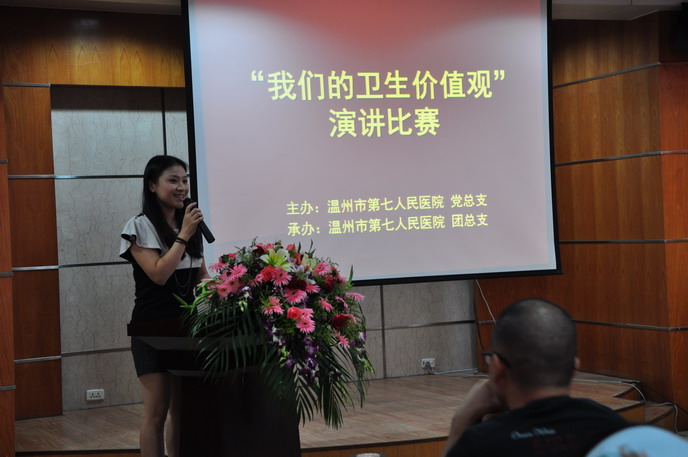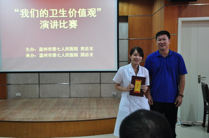党总支在全院范围内开展“我们的卫生价值观大讨论”主题演讲比赛。2012年8月31日演讲比赛拉开帷幕,由胡立荣院长,施肖峰书记,林崇光、姜德国、郑维芳副院长,党办卢捷梅主任组成的评委团,另外还特邀了嘉宾评委——温州广播电台著名主持人吴桅老师。选手的演讲声情并茂,让人感动,讲述着一件件工作中真实的事件和坚守本职岗位的信念。比赛结束,吴桅老师专业的点评给参加的选手收获颇多,胡立荣院长慷慨激昂的讲话更是让所有的参赛者和观众为之一振。第七团支部获得了团体一等奖的优异成绩,第七团支部的徐郑玉夺得了个人一等奖。
