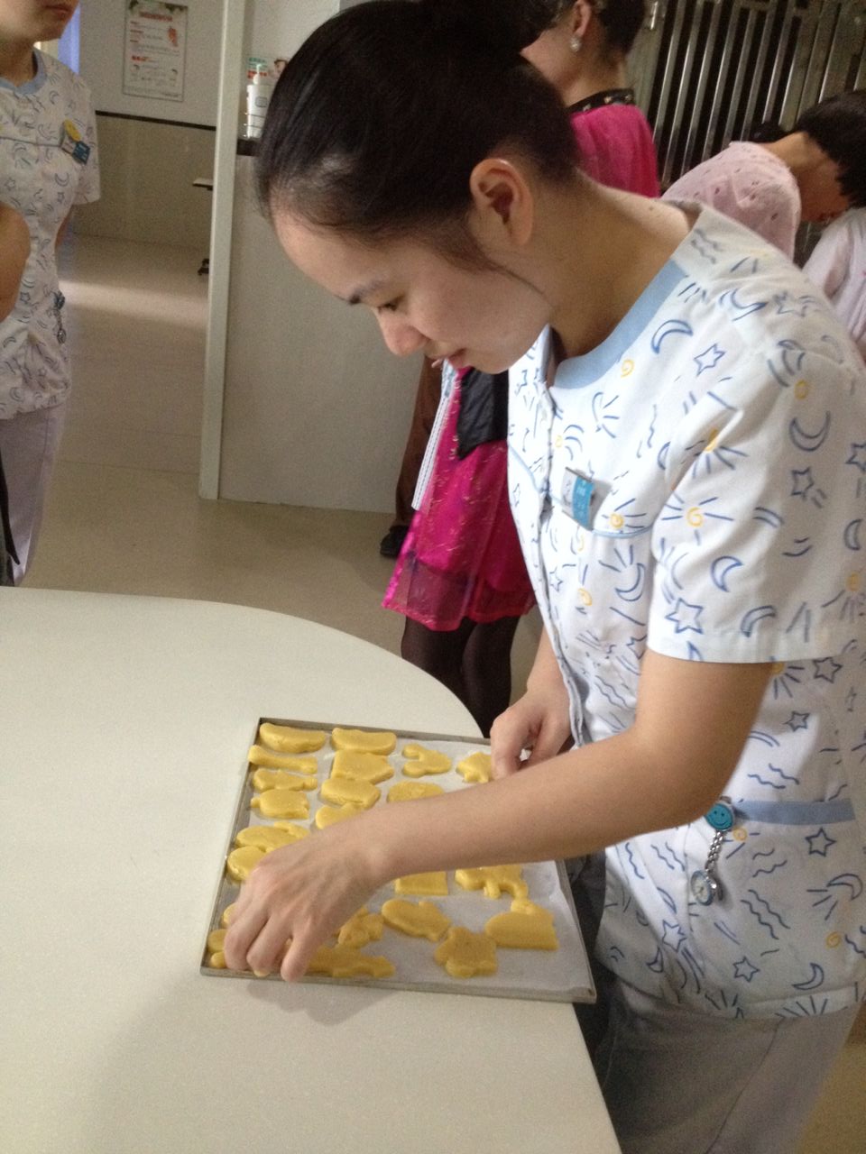 当天,志愿者们自主筹集活动经费,利用午休时间,购买活动材料。患者兴致勃勃得揉面、擀面,印模、烘焙,在不知不觉中加强了互动和交流,科室里充满了欢声笑语。20分钟后,烤箱里飘出香浓的奶油味,大家一起分享自己的劳动成果。患者们尝着自己亲手做的饼干,个个心满意足,使得患者家属倍感欣慰,他们提议:“护士,我们自己捐钱,你们帮我们多组织一些类似活动吧。”