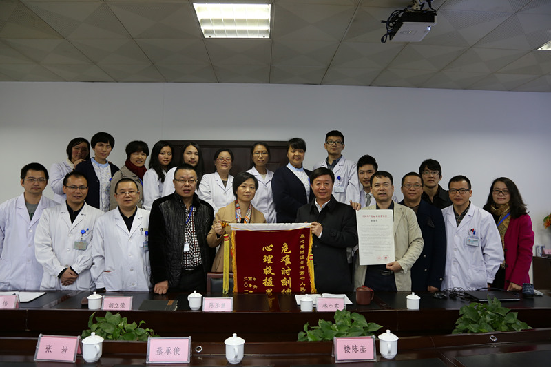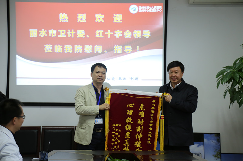 12月9日,丽水市卫计委副主任蔡承俊、办公室副主任楼陈基,红十字会心理救援队副队长张岩受丽水市市委市政府委托,在温州市卫计委副主任陈乐慧的陪同下,到市七医亲切慰问参与里东灾情心理救援工作的心理援助队队员,并送上锦旗和感谢信。市七医院长林小东,书记胡立荣、副院长张伟及相关科室负责人陪同慰问。