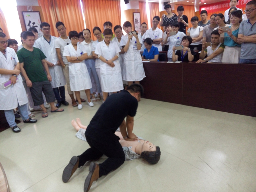 易站长还让大家就临床上碰到的问题提出来一起探讨,大家踊跃提出了各自临床上碰到的问题,易站长一一做了解答。最后,为了让大家能更好掌握这些急救重要的技能,易站长亲自做了模型演练,边讲解边做。为了大家对按压节律有更深体会,他风趣地说:“这个按压的速度和时下流行的歌曲《小苹果》的节奏一样。”现场的医护人员就用手机播放《小苹果》,易站长跟着节奏按压,每分钟至少100次以上,大家对按压节律更能了然于胸。