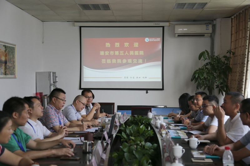 7月29日上午,瑞安市第五人民医院一行12人在院长郑孙懒的带领下,来院学习交流医院管理,双下沉、两提升,医院运行、病房管理等方面的先进经验。