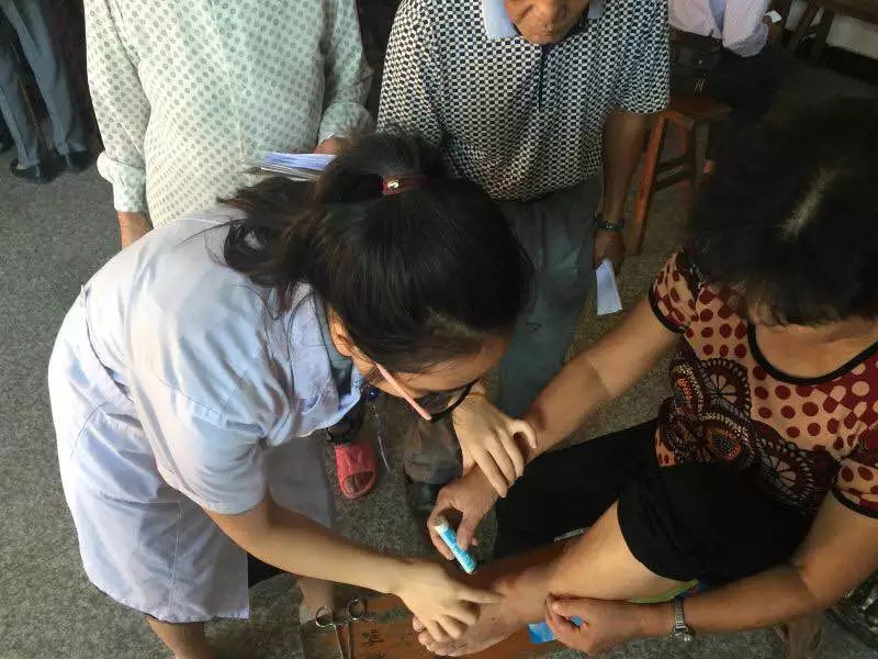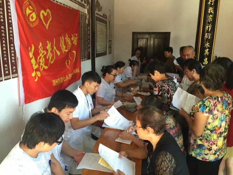 老年科护士长陈建敏带领医疗团队在永嘉罗溪村文化大礼堂启动义诊活动,为社区老年人免费提供健康咨询、体检服务、中医康复治疗和老年痴呆筛查。