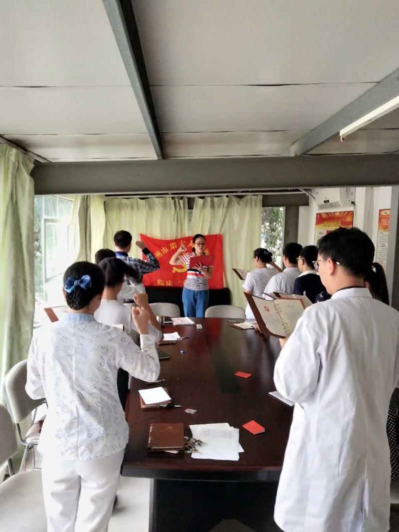 活动开始前,党支部书记陈靖为集体过政治生日的党员们送上了笔记本并附上贺卡,为他们送上党组织的关怀和祝福。作为普通党员身份参加党日活动的副院长郑维芳收到政治生日贺卡说,这是他入党十几年第一次集体过政治生日,既感动又温馨。活动中,党员签到、佩戴党徽、交纳党费、通报主题、重温入党誓言等12项规定动作一项不少。特别是对着党旗重温入党誓言时刻,每位党员铿锵有力的誓词再次点燃了大家初入党的热情,抒发了多年来对党的深情和热爱。针对这次主题党日,党支部书记陈靖为大家上了一堂《党组织生活怎么看,怎么办》微党课,进一步提升了全体党员对党员组织生活重要性的认识。