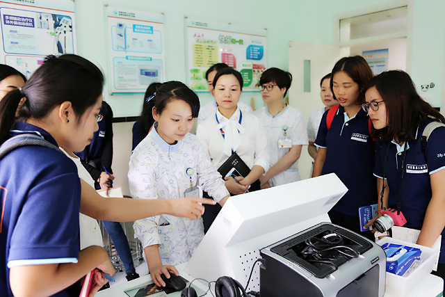 随后,方春霞副主任陪同师生们参观走访了老年科、康复科。在老年科,师生们对老年痴呆患者的认知功能治疗仪表现出了浓厚的兴趣,他们聚精会神地观看护士对仪器的操作和演绎,不时伸出大拇指称赞。