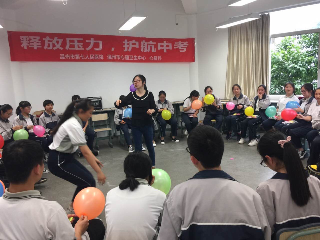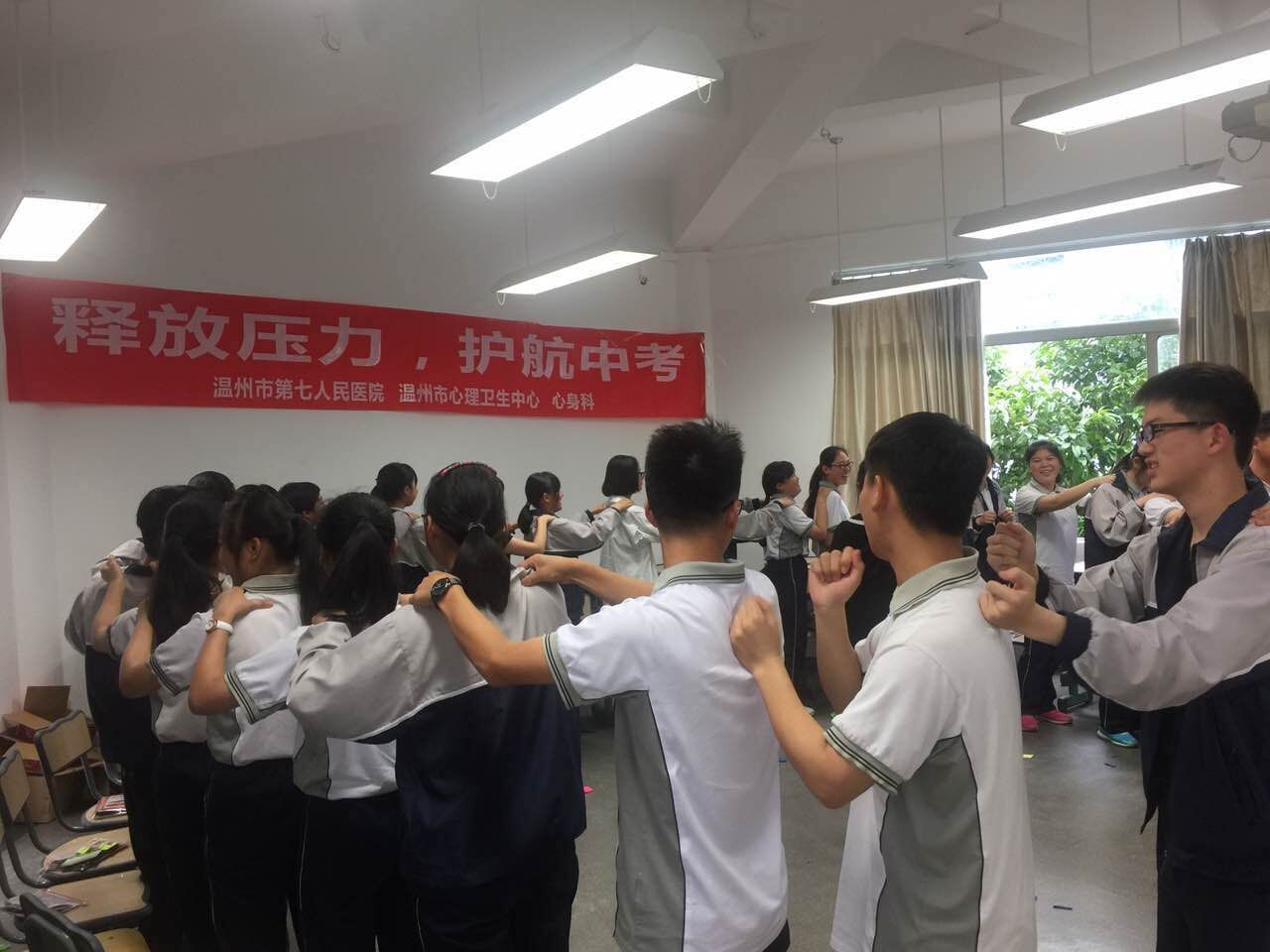 为帮助同学们有效释放考前压力,当天的活动还设计了“吹、踩压力球”、“按摩放松”两个活动,在一动一静中,初三同学彻底释放了压抑在心中的各种压力和包袱。最后在“分享与激励”环节中,同学、好朋友之间互相鼓励,并送上最真挚的拥抱和真心的祝福,由此同学们对于即将到来的中考充满了信心和力量。
