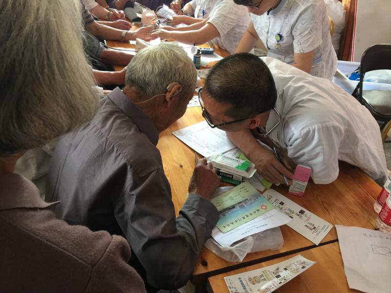 义诊现场,老人们则有秩序地排好队,围在医疗队成员的周围等待检查。体检发现:村中老人普遍对慢性病的认识度不高、自我照顾的水平较低,高血压人员较多,个别老人有痴呆、抑郁的倾向,但都未引起重视。
