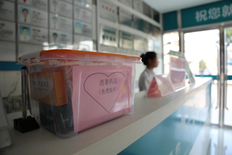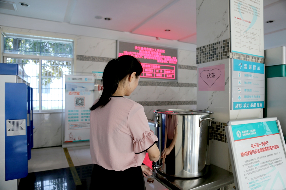 门诊大厅内,顿时习习凉意扑面而来。在导医台前,一个粉红色爱心标识的“消暑驿站”特别引人瞩目。原来,这是该院提供的一项温馨便民服务,为前来医院就诊的患者和家属无偿提供消暑药品和伏茶饮品。