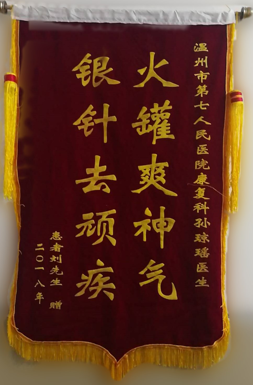 近日,康复科孙琼瑶医生收到出院患者刘先生送来的一份珍贵礼物——锦旗。鲜红的锦旗上,“银针去顽疾,火罐爽神气”十个金色大字熠熠生辉,映衬着刘先生脸上的笑容更加灿烂。患者刘先生言语诚恳,感情真挚地表达了对孙琼瑶医生医德高尚、医术精湛、医者仁心的满怀感激和无尽的感谢之情。同时再三感谢温州市第七人民全体医护人员在他住院期间对他的精心治疗和热心服务。