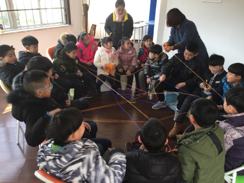 在这里,孩子们首先通过自我介绍,训练他们的注意力、倾听和交往的能力,也作为大家相互认识的过程。在热身结束后开始自由绘画,工作人员要求孩子在长方形、圆形、波浪线等基础上自由绘画,充分发挥创造力与想象力,看看谁画得更有意思。第三个游戏是解千千结,大家相互手牵手缠绕在一起之后,要通过团队协作把手全部解开才算完成任务。在游戏过程中,有人要蹲下来,有人要跨过去,其中一个小朋友很担心会踩到或弄脏对方的衣服,另一个小伙伴爽朗的说没关系,大家携手花费了较长的时间来解结,没有一个人说辛苦,他们给出的答案是因为团结。