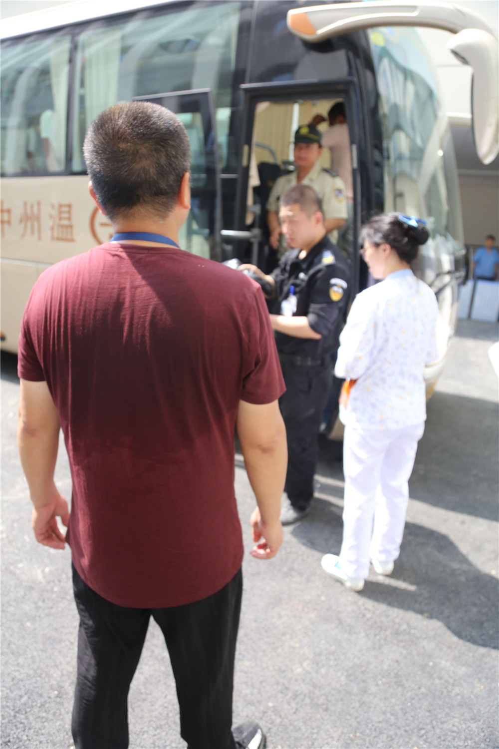 太阳炙热,所有守护在门口的人员都已大汗淋漓,而在人群中特别引人注目的正是保卫科的“才叔”,汗水早已湿透他的背,T恤紧紧地粘在他的背上,他却全然不知,全神贯注地盯着大巴上下来的每一位患者,深怕一个走神“落”掉一名患者。