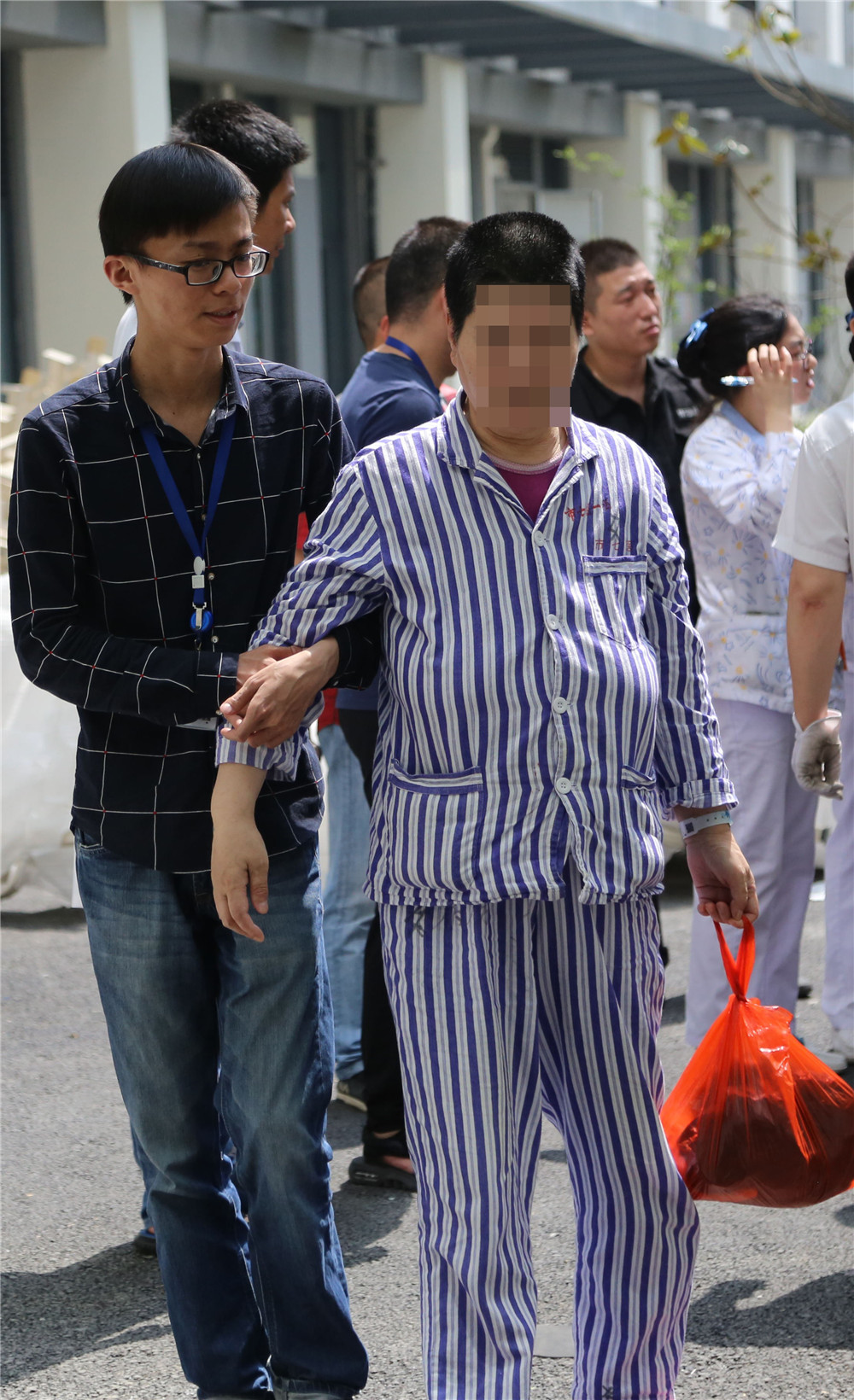 老年精神科患者行动不便、年纪大,需要医护人员搀扶、推轮椅,或者是担架运送才能完成安全转移。但由于医护人员资源有限,行政人员忙里见缝插针,也加入到护送患者的行列中来。