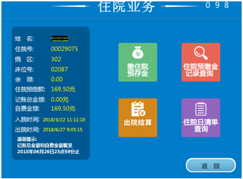 病区床边结算和自助出院结算功能上线后,患者在护士站或自助终端就可办理出院,大大减少排队等待时间,避免来回奔波的麻烦。目前,医院为患者办理出院提供多种结算方式,包括预缴款结算、POS机刷卡结算、预缴款与POS机结合结算等,更提供预缴款余额秒退服务,实现住院无现金化。此外,自助终端还提供住院发票和住院清单自助打印服务。