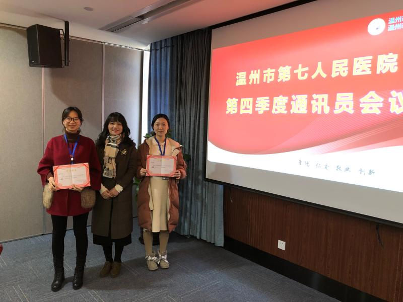 各科室、病区2018年度新闻宣传信息报送情况,全年院办共收到各科室、病区报送信息983条,医院门户网站(外网)共采用信息236条、内网共采用信息764条。其中被国家级刊物:《健康报》、《中国人口报》、《新华网》、《人民日报海外网》录用13篇;被省级媒体刊物:《健康浙江》、《浙江新闻》录用18篇;被市级媒体:《温州晚报》、《温州都市报》、《温州日报》共录用131篇;被市卫计委网站、《健康温州》公众号、《健康温州报》采用信息65条。最后,陈春棉对2018年度宣传先进科室、先进病区和先进个人三个奖项进行了颁奖。