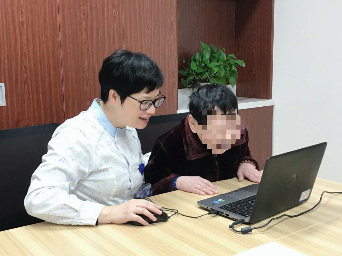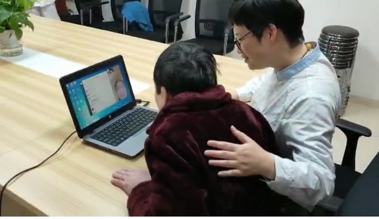 八楼住院楼示教室内,小兰正与她家人暖情视频通话,虽然因为智力低下的关系,小兰不会表达一些深刻的情感,可是,对家人的爱,几乎就是不需要训练的,面对着显示屏中的亲人,她也会动情地说:“小丽(患者妹妹、化名),真的很想你们了,你看这样你们多好,你们不用跨洋来看我了。你放心,我在这个家里很好”,妹妹在海洋那一头热泪盈眶、哽咽不能语,也是在这样一次安排中,老年科的医护人员一不小心也促成了小兰人生中的第一次,她生平第一次见到了她素昧谋面、现在已经是美国的一个检察官的弟弟,画面定格在“你说你笑,你动我懂”的温馨镜头,而这个一幕真情的自然流露,难道不是最真挚的礼物吗?