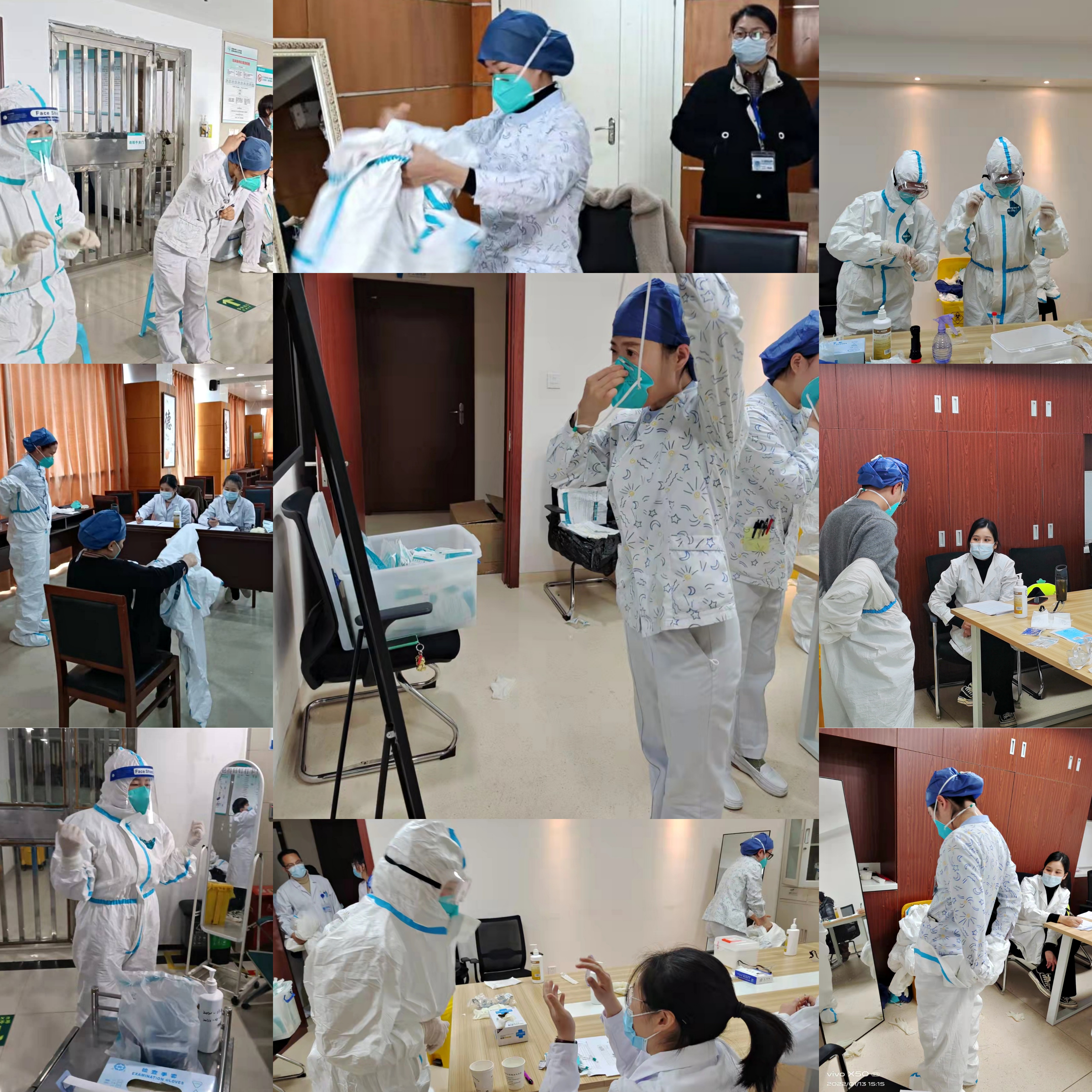 虽然参加考核的人数多,时间紧,但是考核有条不紊进行。考核物品已经由医务科提前备好了。穿防护服、脱防护服、采集核酸同时多名医务人员在进行操作,虽然环境有点嘈杂,但是被考和考官做到彼此眼里只有对方,考官的眼睛牢牢地盯住操作者,其他环境声音都被自动屏蔽掉。考官们言语温和,但是态度绝不含糊,技术要点一个个抠,边抠边讲解。“戴眼罩或防护面屏不能直接压皮肤,要压在防护服外面。”“防护服的帽子要盖住里面一次性帽子,所以这些步骤需要照镜子进行,还有女士的头发太长太多扎好的丸子太大也会导致防护服的帽子拉不过来,所以万一要临时拉出去应急做采集核酸,头发还是要处理一下。”“活动一下防护服是否适合应该在最后的步骤,而不是在戴手套之前,因为手套要压住袖口,会影响防护服的合适度,所以最后试可以及时调整。”“采集的时候,棉签不要碰到其他部位,折的时候手不要离管口太近,喷洒消毒水千万不要喷到条码”......