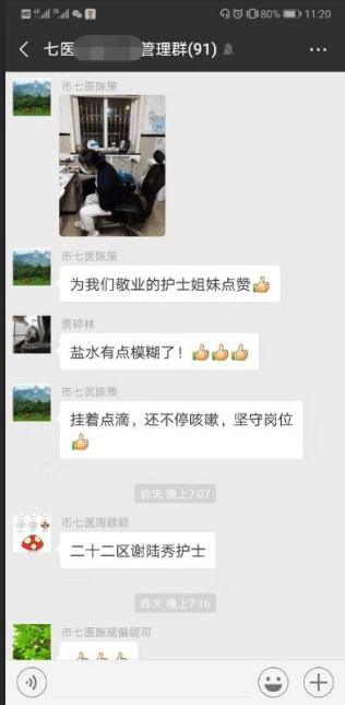 “吊瓶护士”的照片也引起了医院领导的关注。市七医党委书记徐象平也在群里第一时间点赞说:“有这样敬业的职工是医院发展的新动力。谢谢你,白衣天使。”同时,他也嘱咐病区护士长尽量给予安排调休。